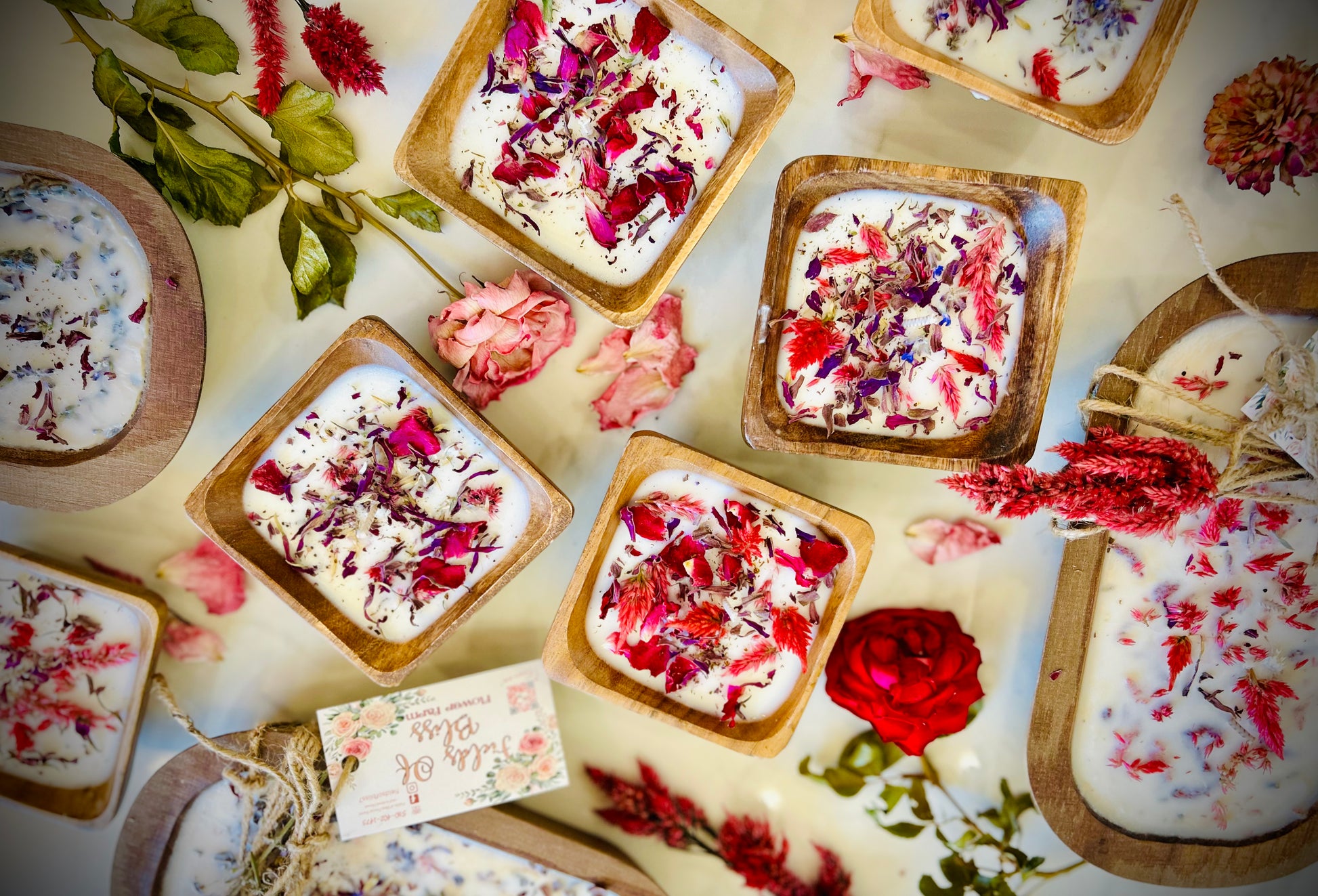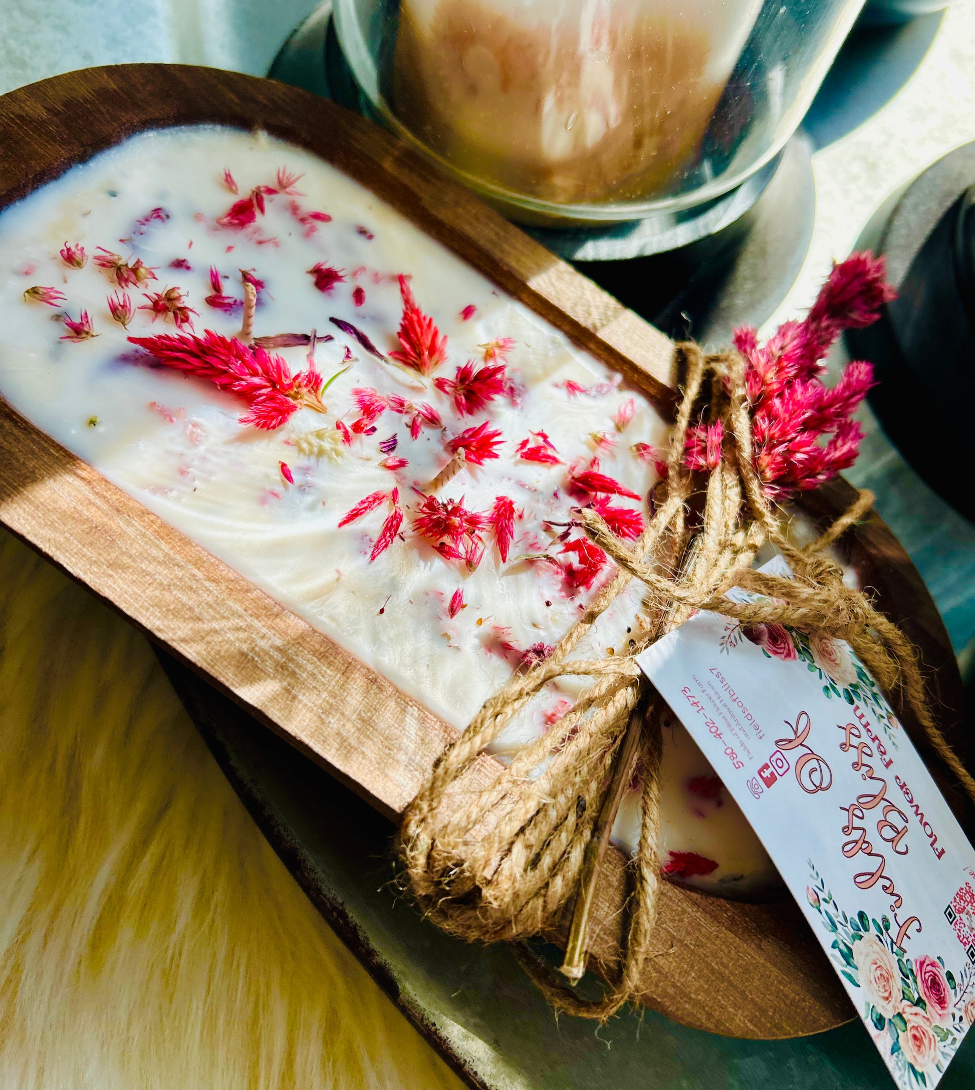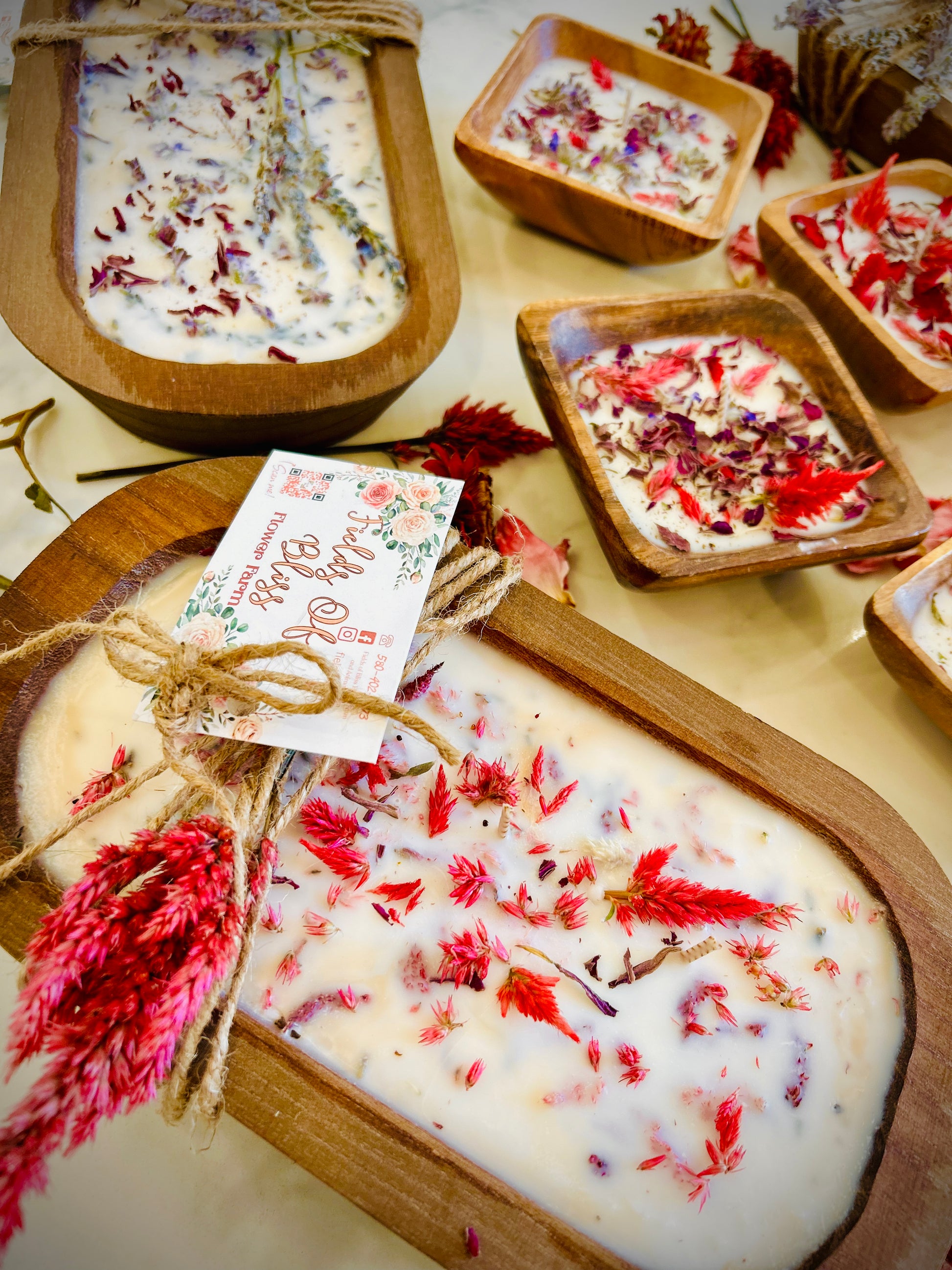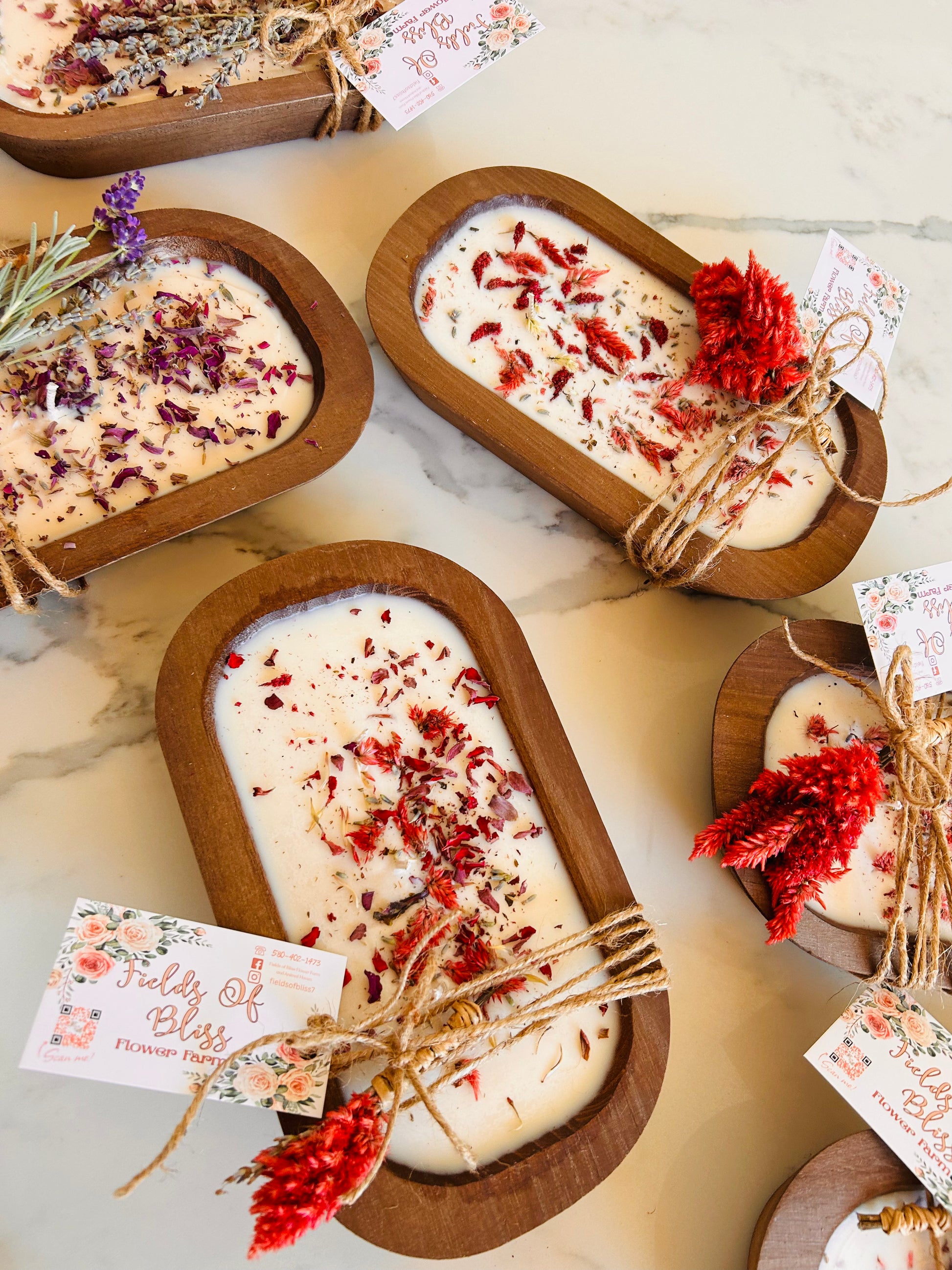 Experience the warmth and charm of our Hand Poured Floral Candles! Crafted from natural soy wax with "Vintage Reserve" scent, presented in beautiful rustic wooden dough bowls. Each candle is thoughtfully decorated with dried flowers harvested directly from the flower farm and finished with a delicate hand-tied twin detail. Ideal for gift giving, housewarming, or bringing cozy elegance to your own space, these candles blend natural beauty with comforting ambiance to brighten any room effortlessly.