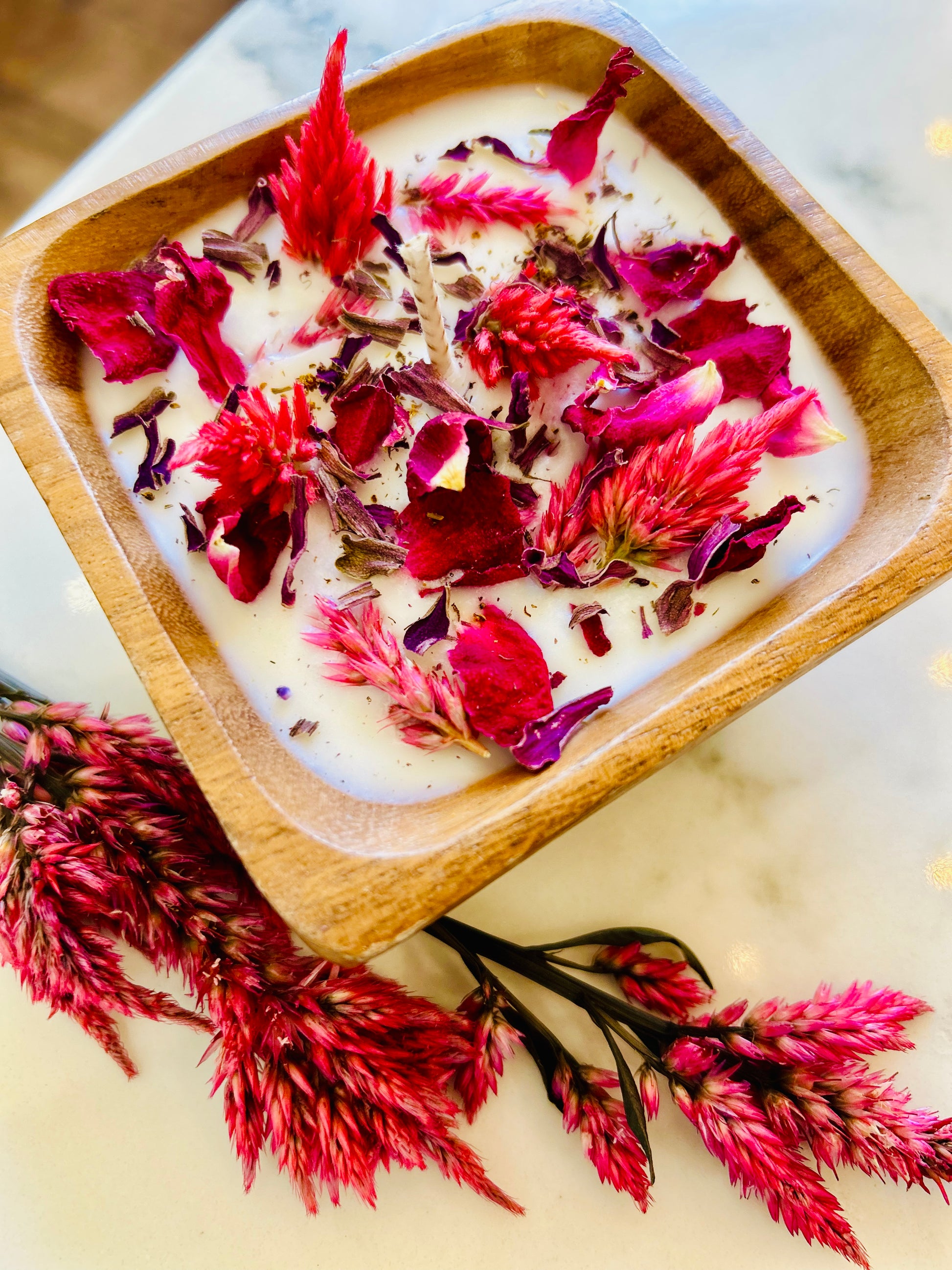 Experience the warmth and charm of our Hand Poured Floral Candles. Crafted from natural soy wax with "Vintage Reserve" scent, presented in beautiful rustic wooden dough bowls. Each candle is thoughtfully decorated with dried flowers harvested directly from the flower farm and finished with a delicate hand-tied twin detail. Ideal for gift giving, housewarming, or bringing cozy elegance to your own space, these candles blend natural beauty with comforting ambiance to brighten any room effortlessly.