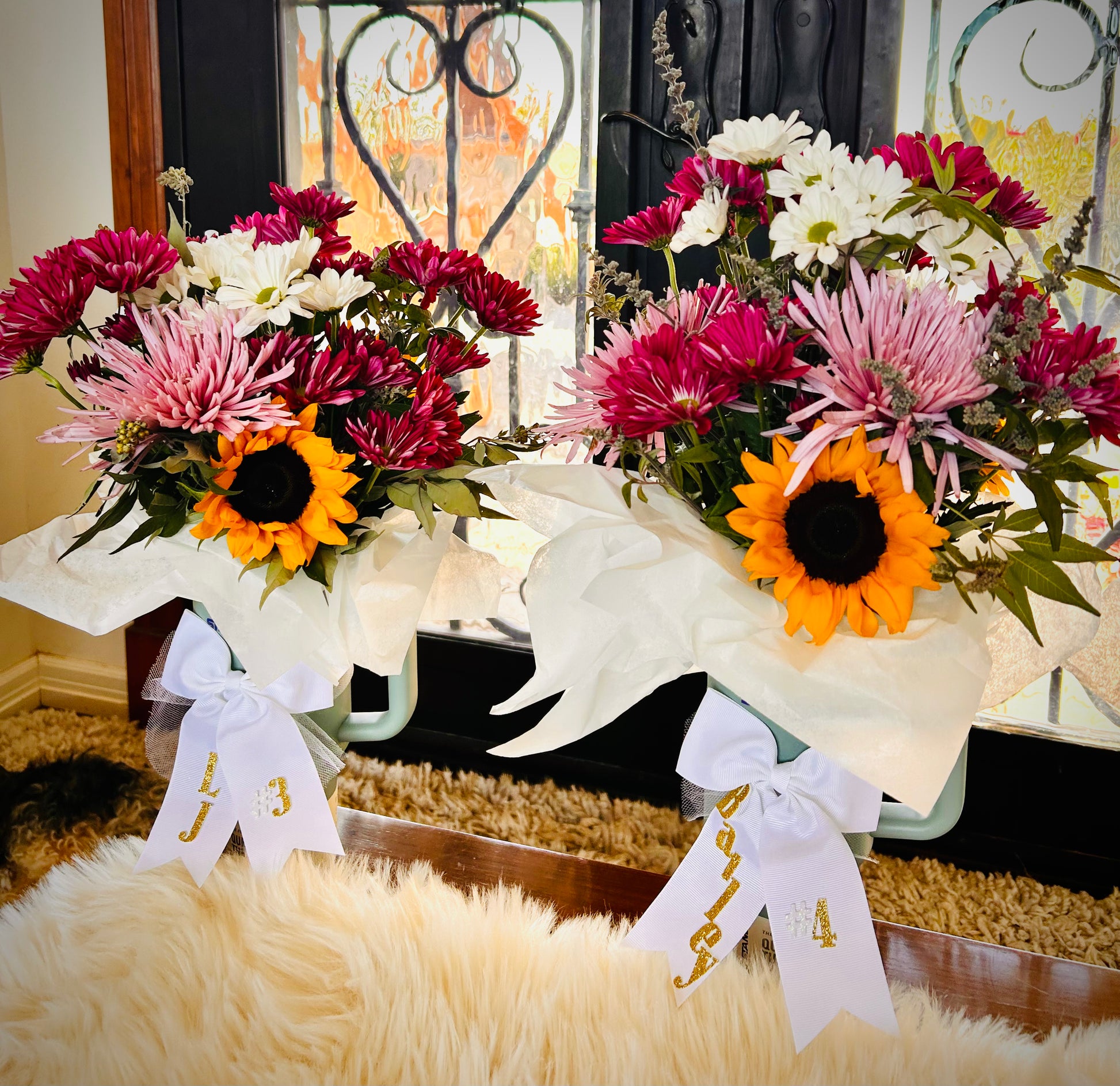 Indulge in a double delight with our Tumbler Bouquet! Sip in style with our 40oz colorful drink tumbler, complete with lid and straw. Enjoy the added beauty of a handcrafted floral bouquet tucked inside your tumbler perfectly adorned with coordinating tissue paper and bow!! Our custom tumbler bouquets make a perfect custom gift for any occasion! Bouquets are delivered to your door or recipients door with card complete with your personalized message!